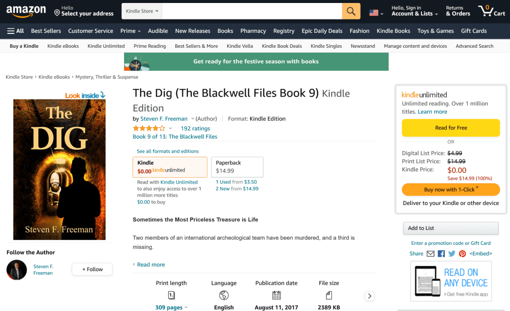 One thing I learned from my authors group is that some authors use KDP Select to price pulse their books if they’re in a series. For those of you who don’t know what price pulsing is, it’s where you lower the price (temporarily) of your book for promotional reasons. This is a good way to get visibility for your other books if sales are lagging. Remember the screen pic of the author who used Bookbub to promote his KU book? If you look at the pic, you’ll see it’s book #9 of a 13 part series. It’s working for him because his book is currently ranked 19 in International Mystery & Crime. Another thing to note is that it’s an older book that was published in 2017. So he didn’t get any special push from the Amazon algorithm which favors new content.