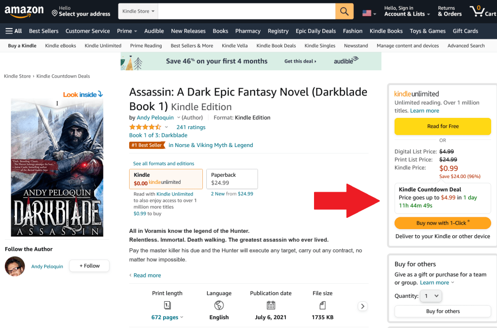 Keep in mind, your book needs to be enrolled in the KDP Select program for at least 30 days and cannot be sold outside of Amazon. However, the results for KCD aren’t too impressive unlike the free days, which is why indie authors don’t bother with it much. It’s also worth noting, you’ll be getting a reduction in profits since the book isn’t at full price. However, some authors use this in conjunction with KU and get results like the author above. As you can see, his book got the #1 Best Seller tab.