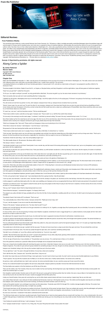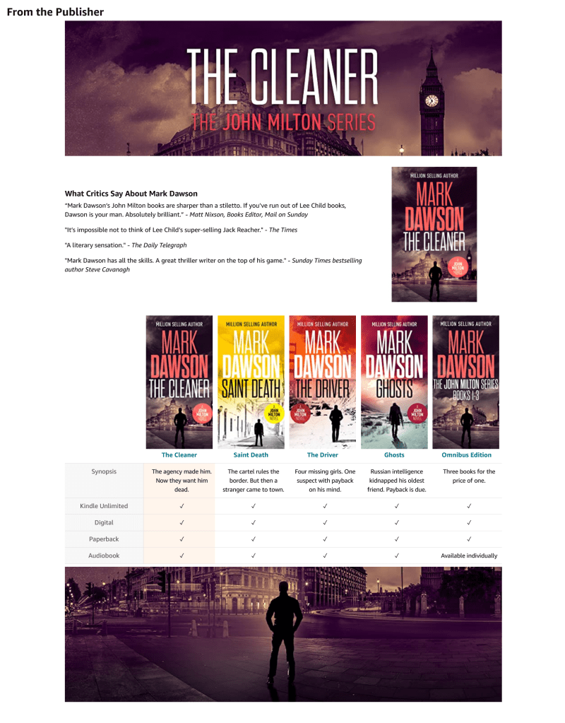 Here thriller author Mark Dawson, uses a comparison chart and a few images for his book: The Cleaner. In the comparison chart, Amazon allows you to add up to 6 ASINs which will link to those books. Amazon also allows you to add excerpts or even entire chapters which James Patterson did below for his blockbuster novel: Along Came A Spider: