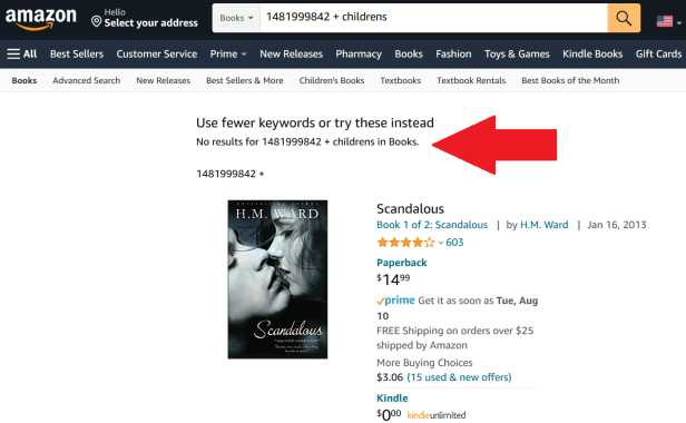 Once you find out who your comp author is, go to the Amazon search engine and type in the title of the book for your look-alike author. In this example, we’ll use H.M. Ward’s book Scandalous: